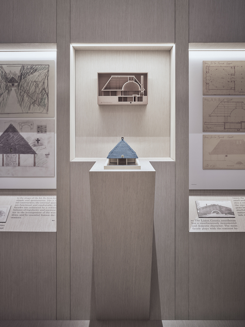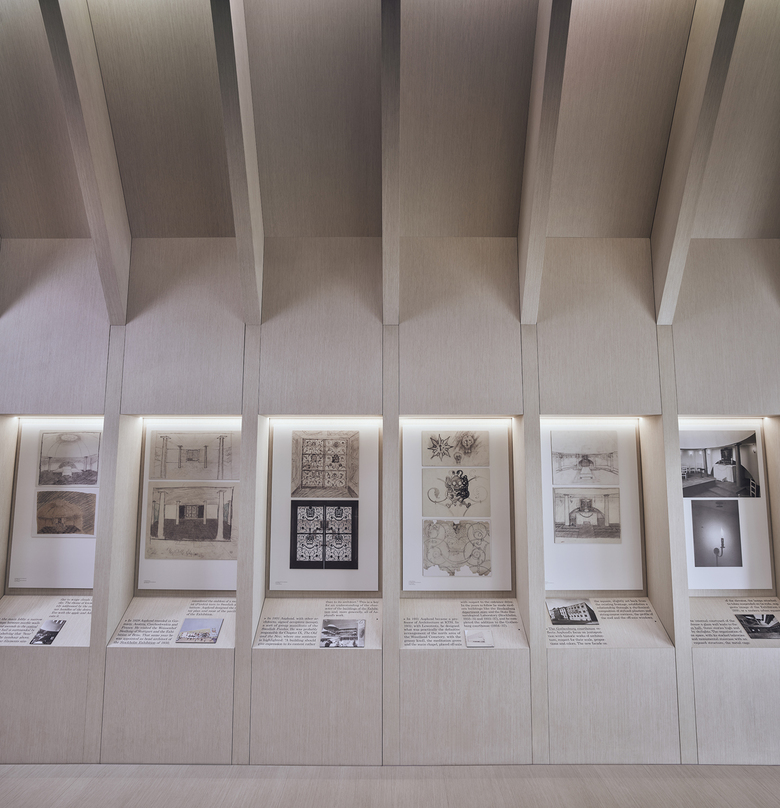 L’allestimento per l’esposizione dei disegni è integrato alla struttura stessa del padiglione: un unicum che definisce l’intero spazio interno ospitando, nell’articolazione dello spessore delle pareti, le riproduzioni dei disegni di progetto di Gunnar Asplund per la Skogskapellet, i testi e i plastici.