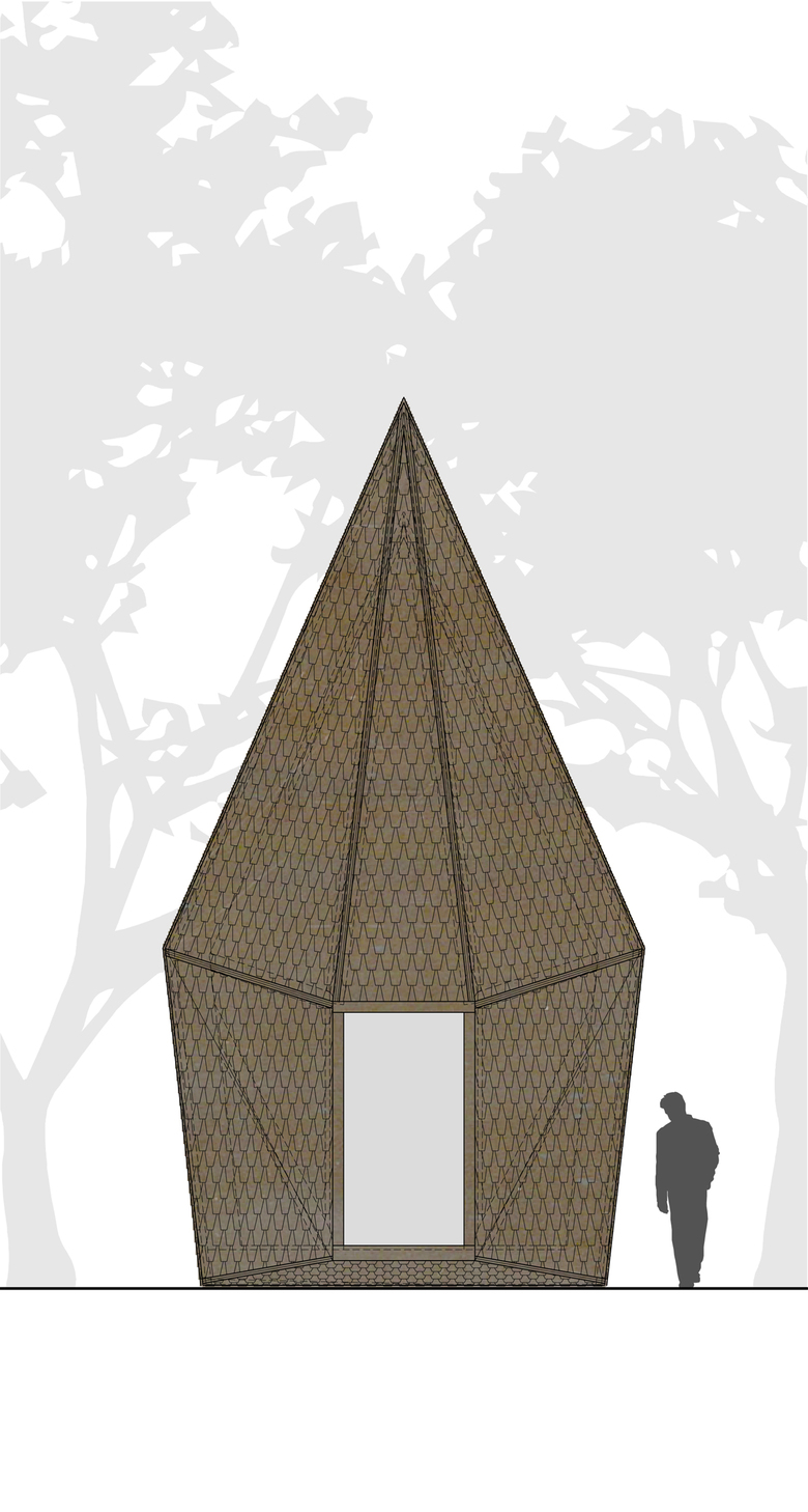 L’elemento nella sua assolutezza intende alludere sia alla stereometria degli edifici d’appoggio (EKONOMIBYGGNAD) disegnati da Asplund e Lewerentz per il cimitero di Skogskyrkogården, sia al tema e alla spazialità della capanna-rifugio nella natura.