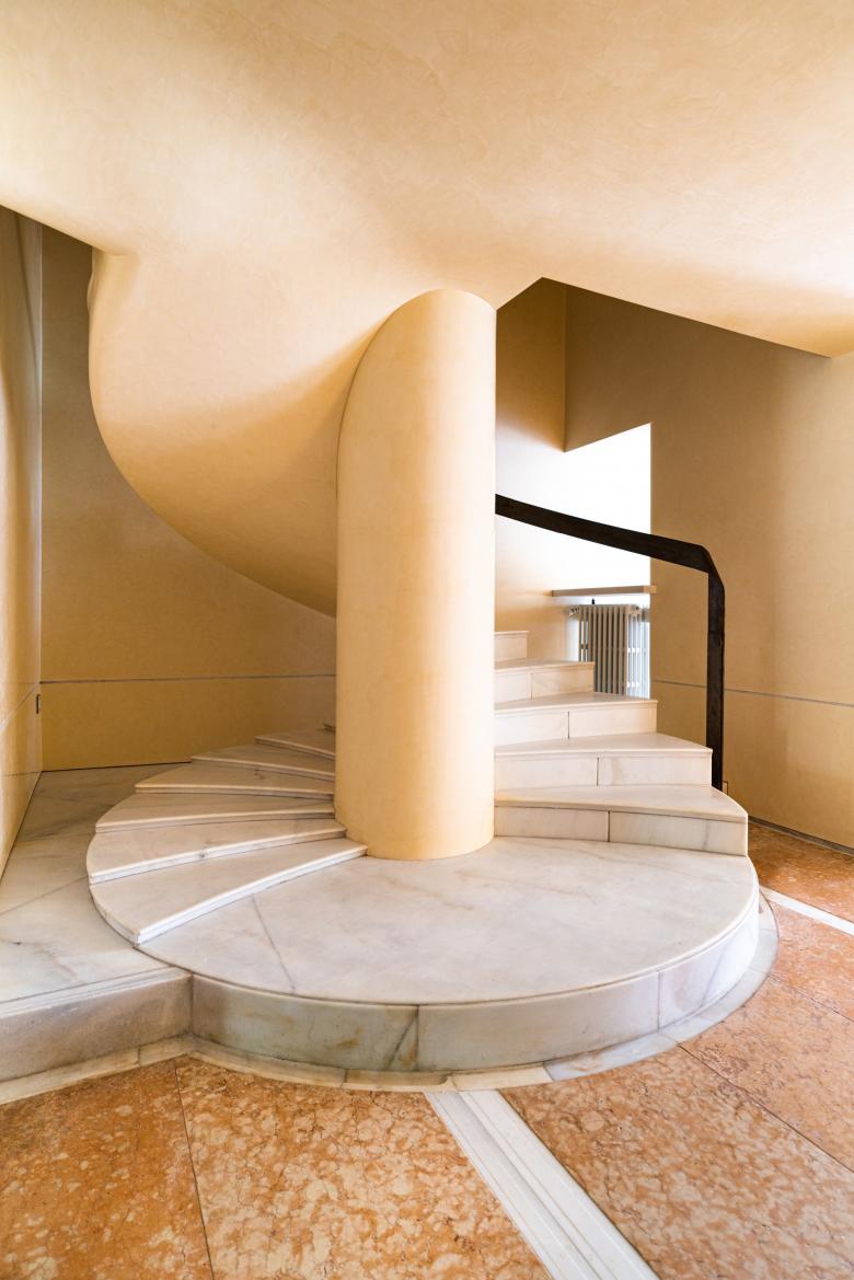 Carlo Scarpa did not follow completion of the building work carefully, due to frequent disagreements with the client Loredana Balboni and his simultaneous commitments on Villa Zentner in Zurich. At the first floor the finishing screed was laid a few millimeters from the edge of the shaped skirting boards in Lasa marble and forced the owner, when Scarpa abandoned the work without leaving any instructions, to lay carpeting, later replaced on the garden side only by a modest linoleum covering.