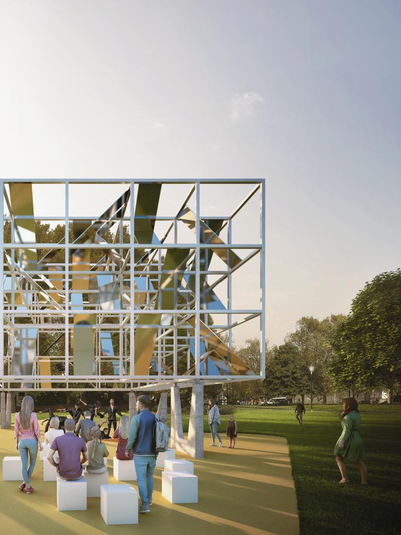 The pavilion's geometric abstraction qualify it as a stage intended to host a multiplicity of ever-changing events, such as the variations of the light that it will be able to reflect. A kaleidoscopic structure that reflects and amplifies activities, people and colors.