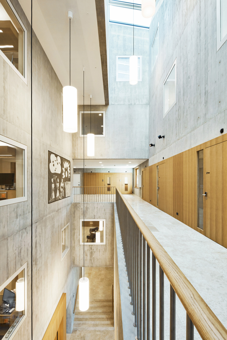 Im lichtdurchflutete Innenhof, dem Herzen des Gebäudes, schweben von uns entiwckelte Pendelleuchten. Sie bringen dem öffene Raum gleichzeitig Repräsentanz durch ihre Grösse und eine heitere Stimmung durch ihre brilliantes Licht.