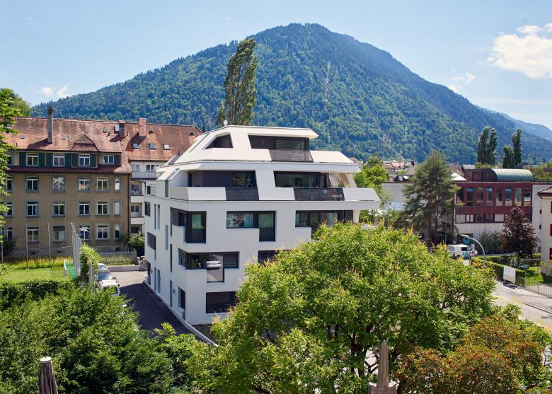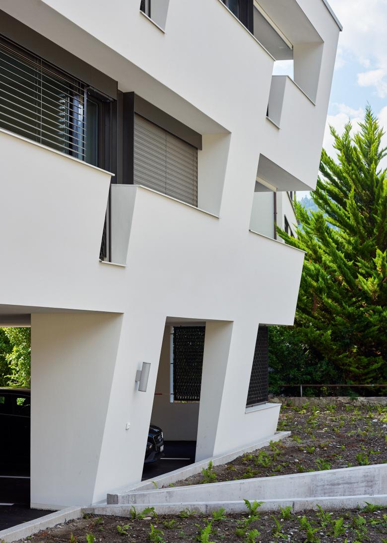 Als Weiterentwicklung und Referenz an die umliegenden historischen Gebäude, steht der murale Charakter des Punktbaus im Vordergrund. Die massive Gebäudehülle wird im Sinn einer Lochfassade wo notwendig aufgelöst und die durch die nicht vorhandene Konvergenz der Wohnungsgrundrisse und der Gebäudehülle entstehenden Zwischenräume bilden die notwendigen Aussenräume, ohne dass das Bild des Solitärs beeinträchtigt wird.