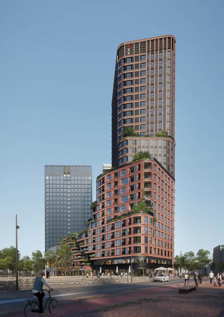 The 28-storey tower accommodates a mixed program with a commercial plinth, social housing and much desired medium-priced rental housing including 406 apartments of which 266 rental homes in the middle segment, 120 at affordable rent, a residential care facility, built-in community facilities, a community centre and commercial facilities such as a bowling and cafe. The lively plinth with catering and local entrepreneurs will become the meeting point of the neighbourhood.The tower is stepped with elegant rounded corners and reaches up to 90 meters high. The side facing Van der Pek neighbourhood has a slender shape with a cascade of green, collective roof terraces and gardens where residents can meet. On the other side, the tower is wider, just like the robust adjacent towers of Overhoeks.
