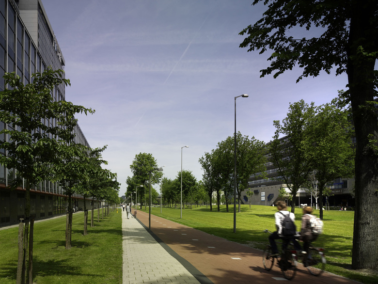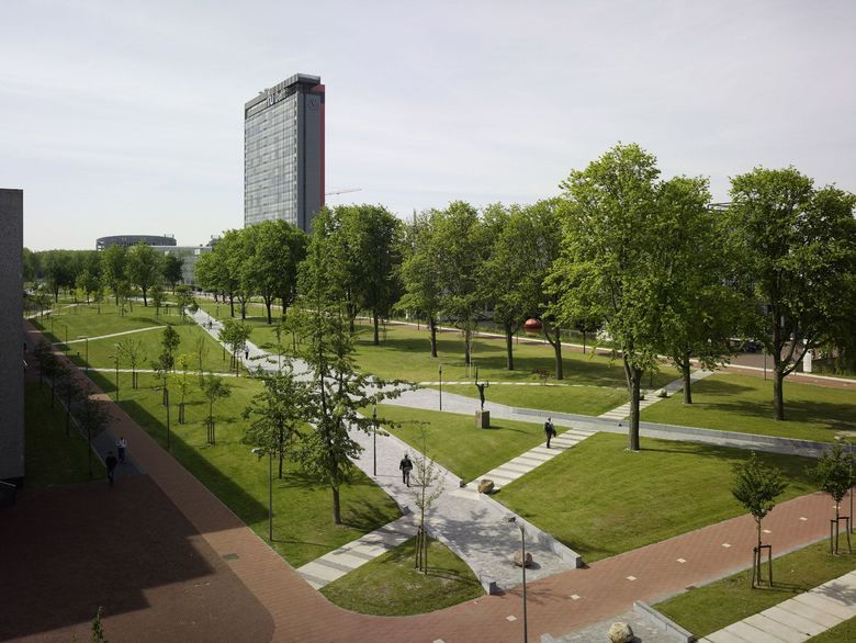 The busy Mekel Road, which divided the campus of the Delft University of Technology (TU Delft), is replaced by the eye-catching Mekel Park. Centrally located, the park connects the various faculties of the TU Delft, and in doing so, reflects the interdisciplinary character of the university.