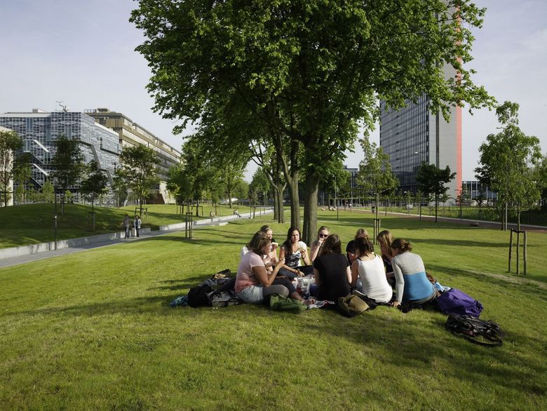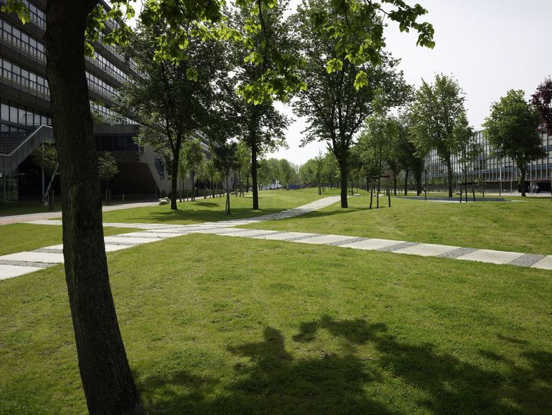 The former sunken car parking areas are transformed into slopes, with resulting height differences that accentuate the landscape of trees. Each faculty has its own entrance square of the park.