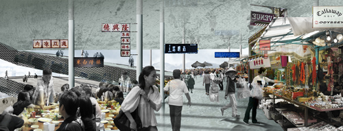 On lower levels, pedestrian bridges connect to the neighboring buildings. Residences and visitors from all directions can enter the public surface, on which street vendors, shopping markets, noisy bars, open-air concerts, wedding ceremonies… all manners of urban life spiraling up in the tower.