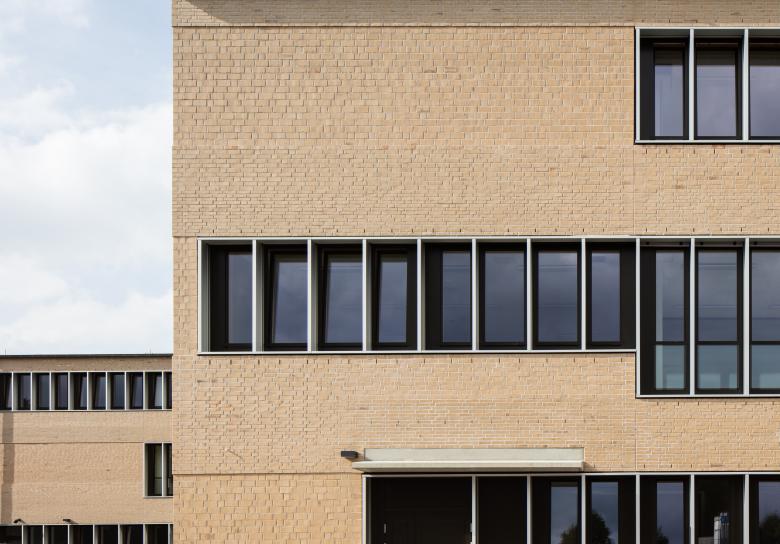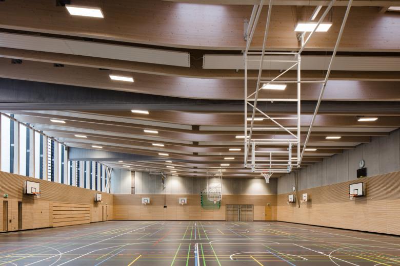 Der Schulneubau gliedert sich in drei Geschosse. Auf einer Basis stehen vier zueinander versetzte Baukörper.Im Erdgeschoss befinden sich die Verwaltung, die Mensa mit Freibereich, die Musikräume, die sich mit der Aula zusammenschalten lassen, die Bibliothek sowie das „Haus der Jugend“. Dieses ist in die Schule integriert, aber auch als separate Einheit nutzbar. Gemeinschaftsflächen und Flächen für den Ganztagsbedarf bilden mit ihren Höfen im Erdgeschoss den Treffpunkt und damit das „Herz der Schule“. Durch den Wechsel von Innen- und Außenräumen entstehen eine hohe Aufenthaltsqualität und eine direkte Verbindung zum Außenraum.