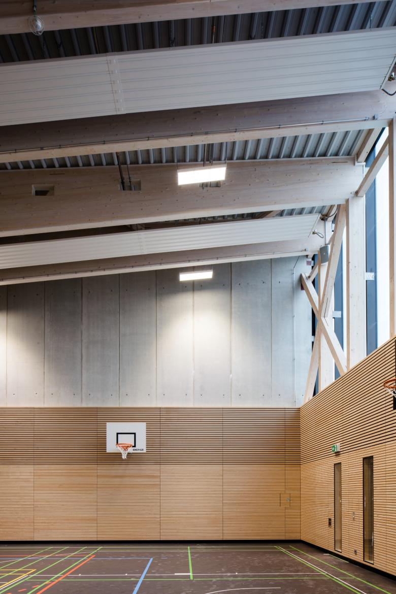 Die Schule und Sporthalle sowie die im Norden des Grundstücks vorgeschlagene Wohnbebauung bilden eine in sich eigenständige Bebauung und fügen sich gleichzeitig in Anordnung, Höhenentwicklung und Maßstäblichkeit in die bauliche Umgebung ein.
