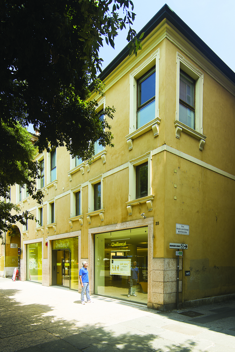 Progetto tipo: filiale di Verona. L'acceso alla filiale avviene direttamente dal piano stradale attraverso l'imponente tunnel di ingresso che contiene l'area self, costituita da due ATM sempre fruibili dagli utenti durante l'intero arco della giornata. La vetrina diventa l'interfaccia con la città: loghi e promovetrina veicolano l'immagine della banca verso l'esterno, mentre al tempo stesso il paesaggio della città diventa sfondo principale delle attività bancarie.
