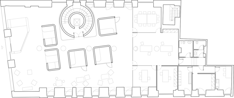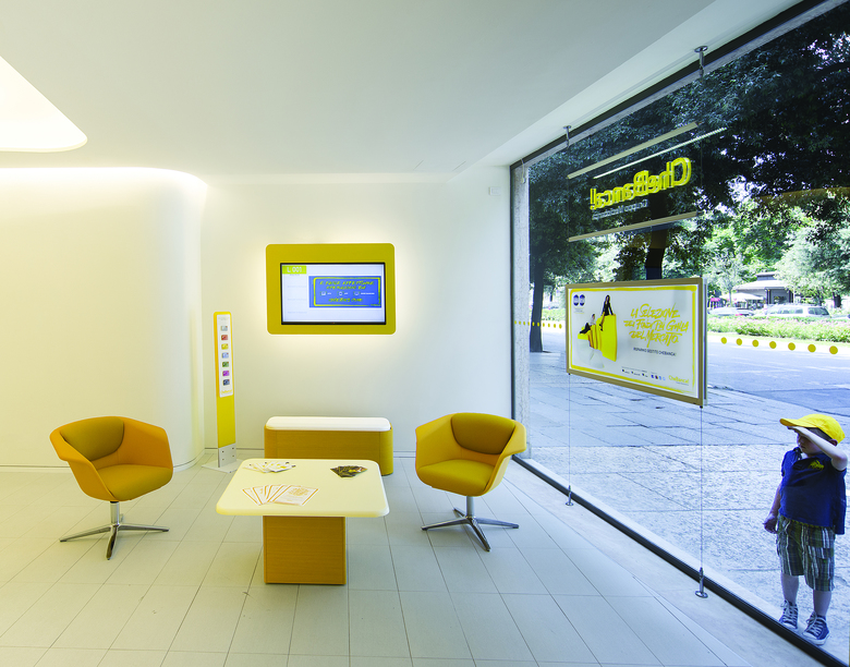 Gli ambienti sono organizzati su tre diversi livelli di privacy; il primo è rappresentato dalle postazioni cassa studiate ergonomicamente per permettere di ospitare gli operatori e i clienti secondo la filosofia del side by side banking: entrambi i soggetti si dispongono sullo stesso lato del tavolo per favorire la trasparenza e la condivisione. Seguono poi le salette chiuse per le attività di consulenza: i moduli consulenza così come le postazioni cassa, sono elementi stand-alone, realizzati fuori opera, aggiornabili tecnologicamente qualora ci fossero mutamenti dei servizi erogati. Al termine del percorso si trovano gli spazi di backoffice, più isolati per garantire lo svolgimento di attività riservate.