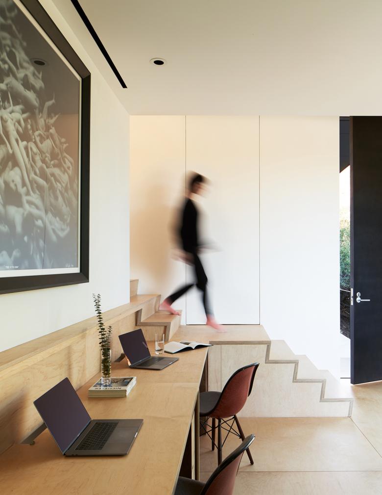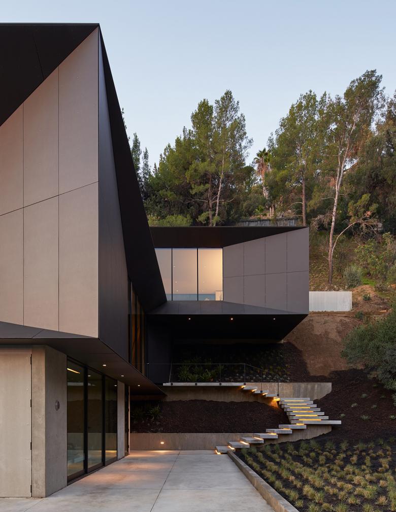 Following the natural grade, the front stairs create an arching path to a bridged entry portal, all the while showcasing panoramic views of the house. As the front door opens, the dark, angular façade of paneled concrete gives way to a light-filled interior of soft wood and bright white finishes. Upon entering, visitors find themselves within an indoor/outdoor living space; framed views of the exterior landscape bathe visitors in natural light and immerse them in the natural world outside. Once inside the residence, stairs descend to a private screening room or ascend to the third-floor living spaces. A series of open terraces mirror the interior living quarters, encompassing almost as much outdoor space as the enclosed third-floor footprint.