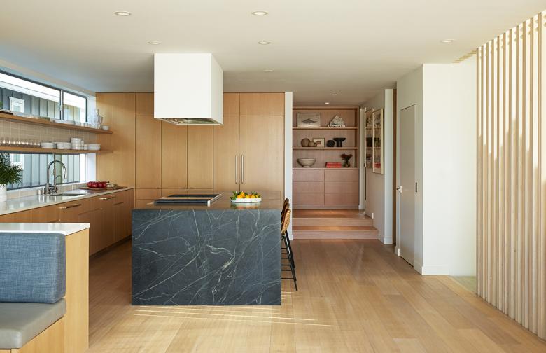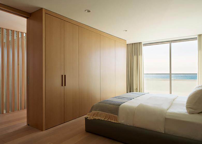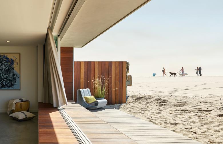 The Oxnard Beach House combines intimate interior spaces with expansive ocean views and a beachfront setting. The home’s three levels are joined by the main design element of the house: a central stair core, screened by wood panels and flooded with abundant natural light courtesy of the coastline. The southern façade features wall-to-wall sliding glass doors on all three levels to further maximize ocean views, and to blur the sightline between the home and the beach itself.