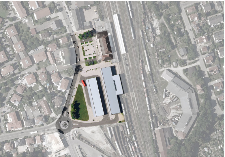 P+R-Gebäude sowie die Überdachung des Busbahnhofes sind parallel zu den Bahngleisen südlich des alten Bahnhofsgebäudes angeordnet. Beide bilden zusammen einen neuen Stadtraum am Bahnhof.