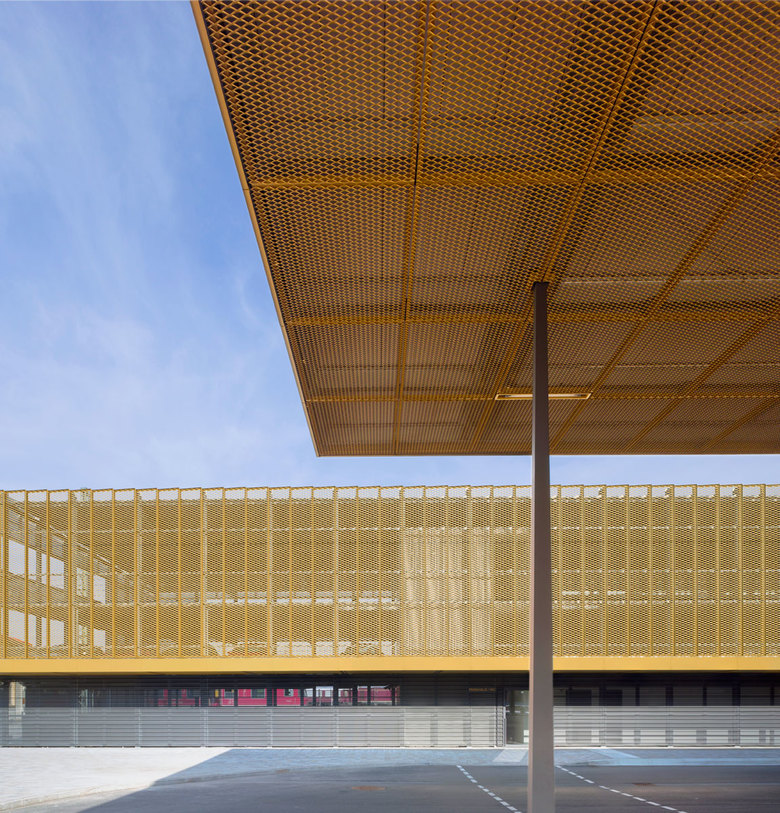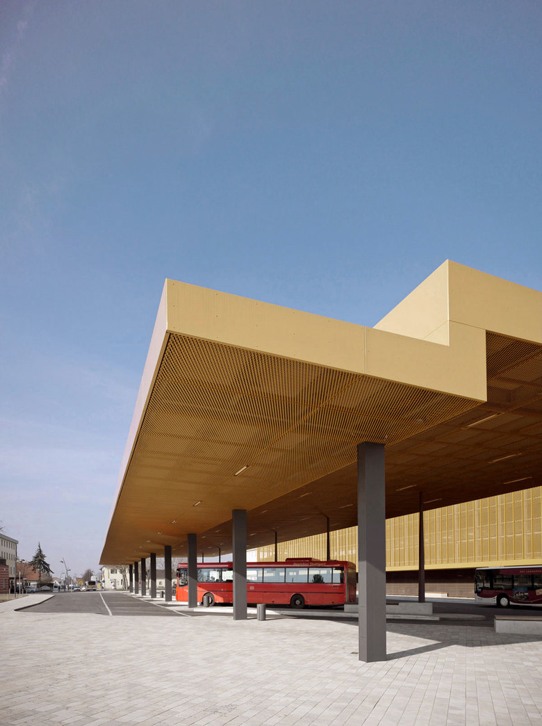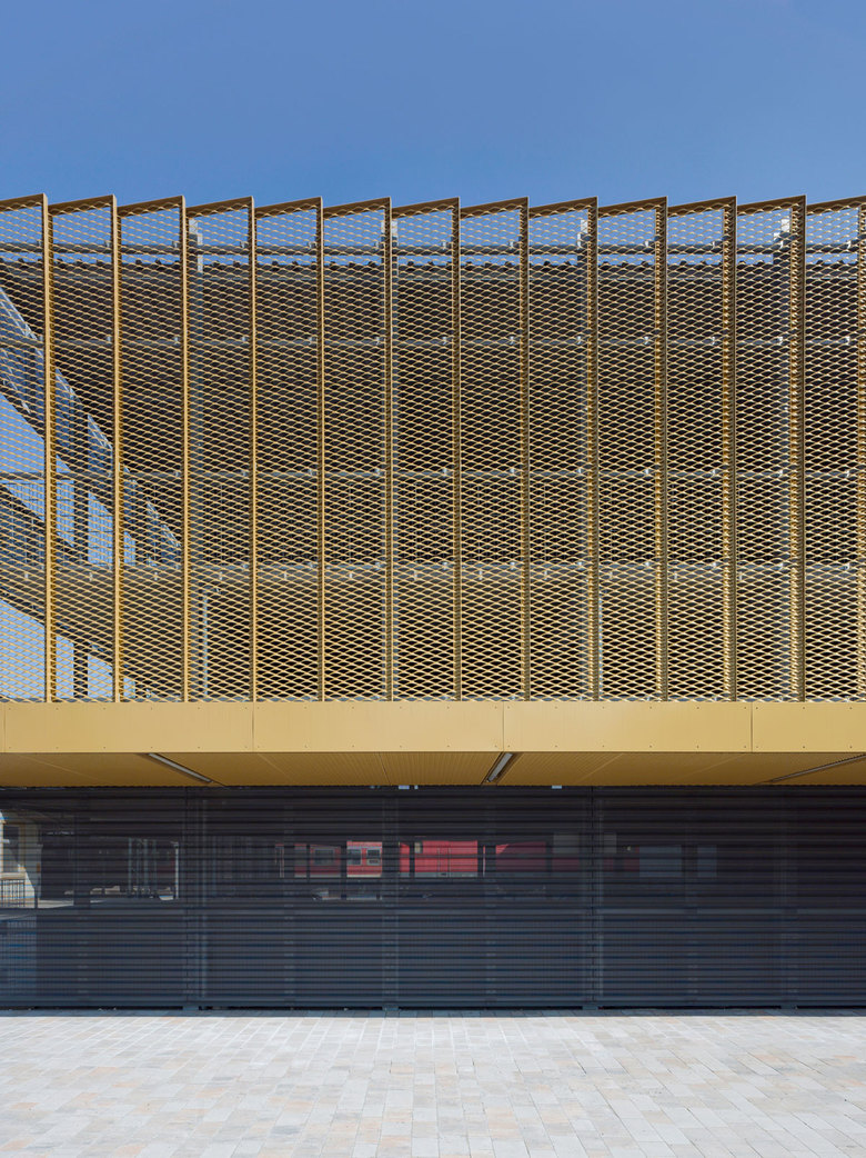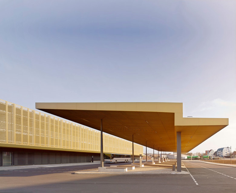 Das 18m breite und 56 m lange Busdach korrespondiert mit der Schaufassade des Parkhauses in Materialwahl und Farbigkeit. Bestimmende Farbe ist ein heller Goldton sowie als Material Streckmetall in unterschiedlichem Perforierungsgrad. Alle weiteren Bauteile wie z.B. die Stützen des Daches und die perforierte Trapezblechverkleidung der Seiten- und Rückwände des Parkhauses sind zurückhaltend anthrazitfarbig gestaltet.