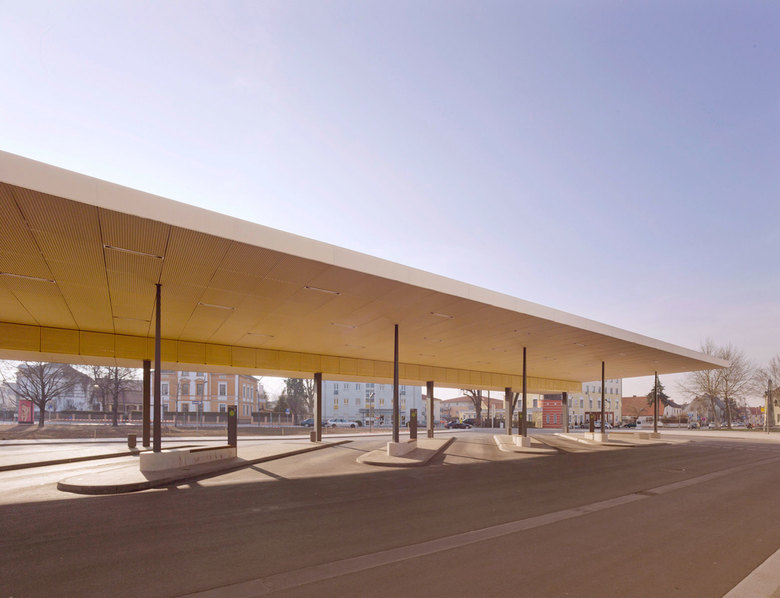 Das Dach als geknickte Scheibe überdeckt im niedrigeren Teilbereich mit 4,5m lichter Höhe eine senkrecht zu den Bussteigen verlaufende Fußgängerfurt, der höhere mit ca. 6m Höhe die Bussteige mit den Wartebereichen. Massiv wirkende, im Querschnitt rechteckig ausgebildete Hauptstützen am Übergang zwischen niedrigem und hohem Dachbereich fassen den Wartebereich als offene Wartehalle. Schmale, sich nach oben konisch verjüngende Stützen stützen das Dach zum Wartebereich wie ein auf Fingerspitzen balanciertes Tablett.