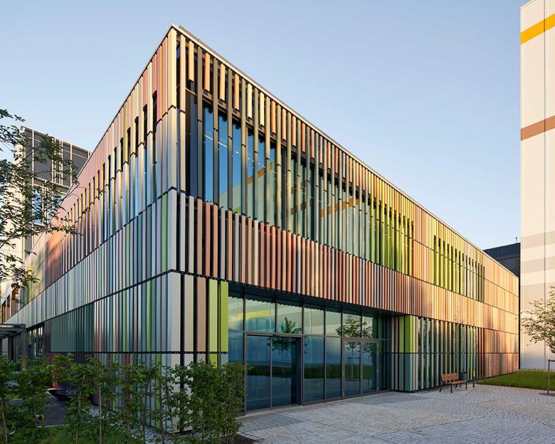 Dieses Zusammenspiel verschiedener Funktionen wie emotionaler Komponenten wird im Fassaden- und Farbkonzept auch nach außen hin sichtbar. Ein Entwurf, mit dem wir die Natürlichkeit der Produkte und der Marke wie ihr stetiges Wachstum symbolisiert haben. Das einerseits bodenständige wie zugleich weltoffene Unternehmen erhält durch einen geschlossenen Gebäudekomplex mit Keramikblende seine Basis, die sich nach oben hin öffnet und Transparenz und internationalen Weitblick vermittelt. Kombiniert mit zeitlosen, natürlichen und leichten Farben, die in Zusammenarbeit mit einer Farbprofessur erarbeitet wurden und im Verlauf der Fassade ein angenehmes und abwechslungsreiches Spiel ergeben.