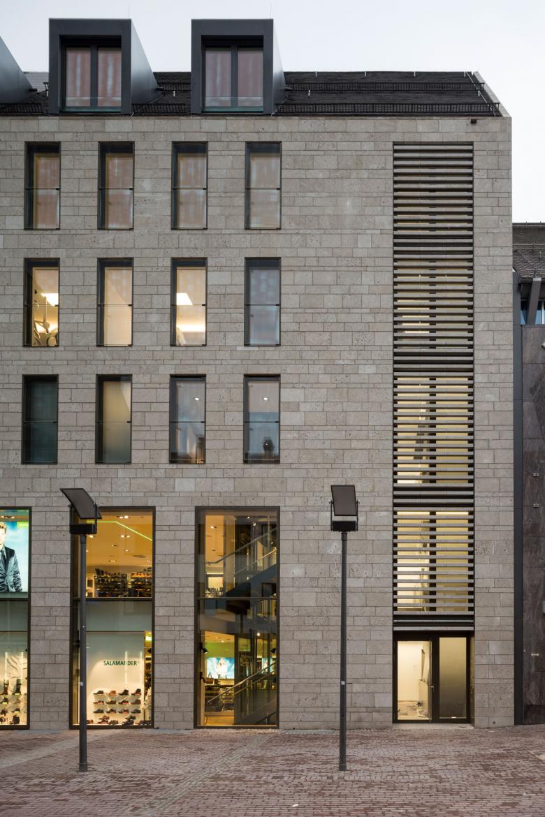 Die Steinlamellen vor der Treppenhausverglasung sowie einem Teil der Giebelfenster heben sich elegant und strukturiert ab und setzen so einen deutlichen Akzent – vor allem in ihrem unterschiedlichen Schattenspiel und ihrer Wirkung bei Tag und bei Nacht. Wir wünschen einen schönen Spaziergang durch die Fußgängerzone.