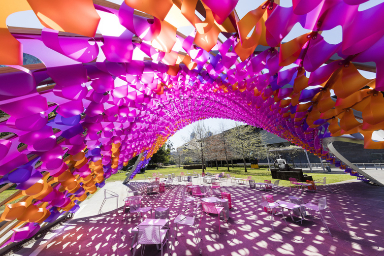 On display on the campus of Rice University in Houston until December 17, 2022, Rana Begum's No.1187 Mesh and No. 1193 Mesh are colorful mesh sculptures meant to "push the material and conceptual possibilities of public artwork."