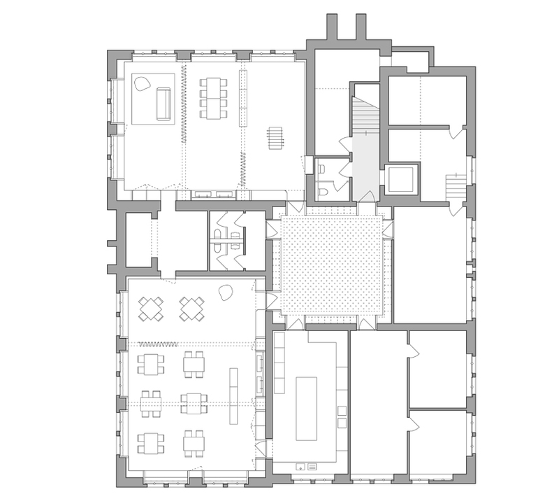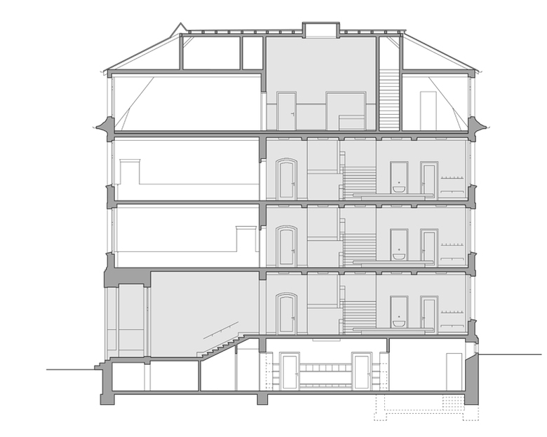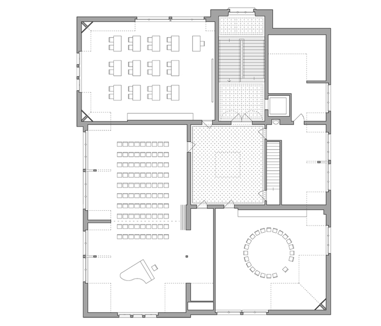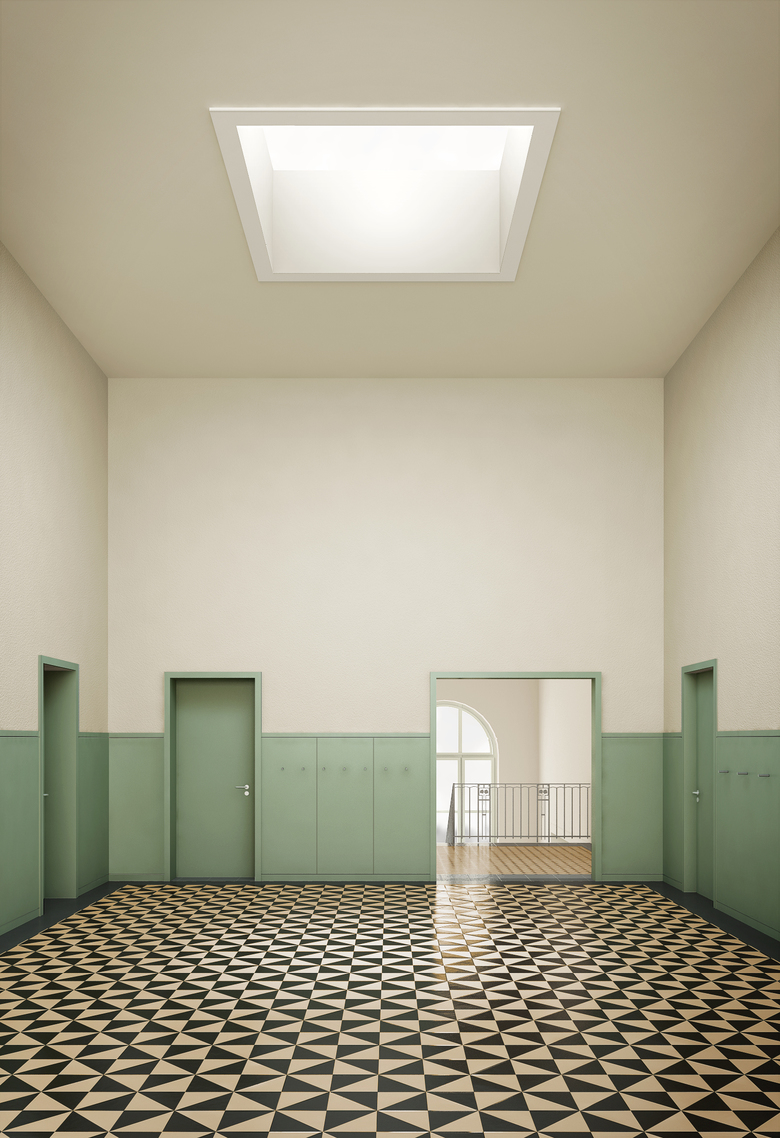 Räumliche Veränderungen erfolgen nur in wenigen, wesentlichen Bereichen des Gebäudes. Im Dachgeschoss wird die Halle zum Treppenhaus abgeschlossen, bis unter das Dach geöffnet und .zenital belichtet. So entsteht ein eigenständiger Foyerraum als Abschluss der Erschliessungsabfolge und als festlicher Auftakt zu den Musikräumen.