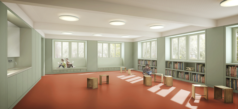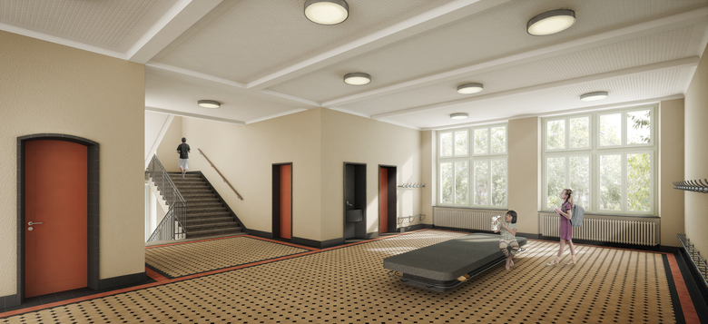 Im Tiefparterre kann der Hort mit prägnanten, raumstrukturellen Korrekturen grosszügig eingerichtet und betrieben werden. Auch hier ist die Halle übersichtlich gross, sammelt und verteilt die Kinder und ist Ausgangspunkt für die unmittelbar angrenzenden Räume. Jeder Aufenthaltsraum ist mit einer verschieden raumhaltigen Wandschale gefasst, in der gebäudetechnische Installationen aufgenommen und vielseitigen Nutzungsbedürfnissen entsprochen werden kann.