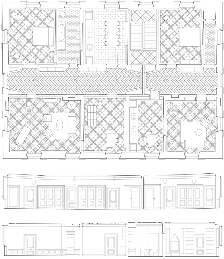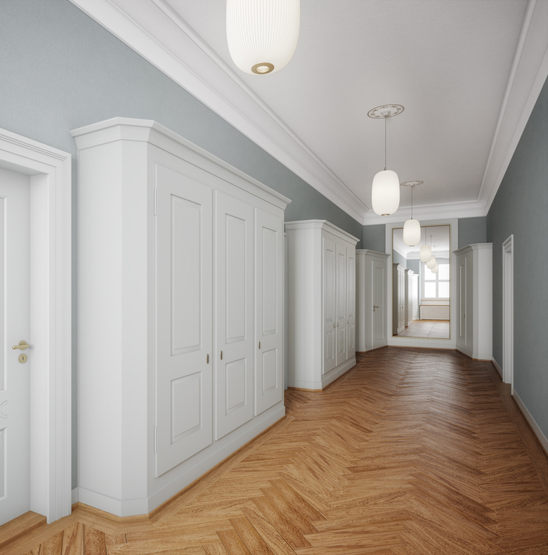 In den Hallen der Wohnungen dominieren aufgereihte Wandschränke. Dazwischen liegen die Zugänge zu den Zimmern. Diese räumliche Eigenheit soll gestärkt werden. Abgeleitet vom Repertoire des Bestands fassen Einbauten von gleicher Höhe die Ecken der Halle räumlich. Dadurch kann eine stärkere in sich abgeschlossene Raumsymmetrie emp- funden werden. Gleichzeitig entsteht Platz für Installati- onen. Dabei verjüngt sich die Geometrie der Einbauten so, dass auf der schmalen Rauminnenseite ein grosser, gerahmter Spiegel das gegenüberliegende Fenster als Motiv erkennen lässt. Mit einer signifikant dem Barock entlehnten Massnahme der Raumspiegelung gelingt die Illusion - im Sinne eines clin d’oeil - einer nach wie vor zweiseitig belichteten Halle. In leichten Variationen kann diese Wirkung auf allen Geschossen erzielt werden.