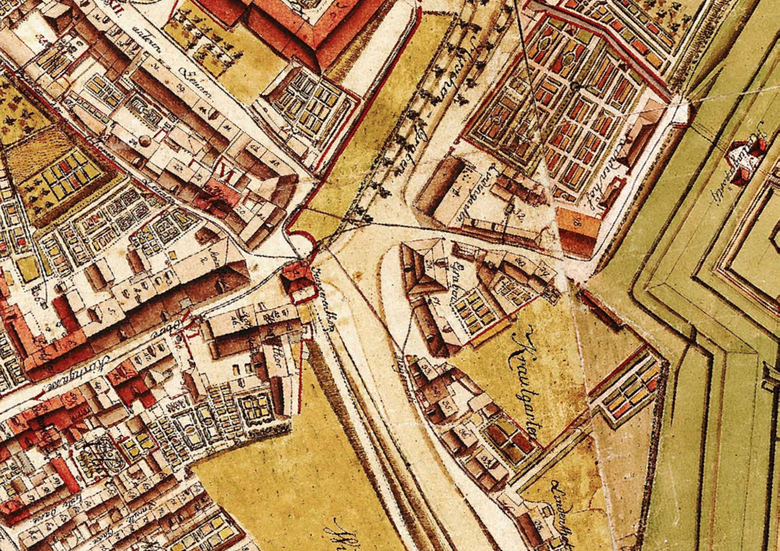 Schon zur Bauzeit des "Haus zum Kiel" war es aus ökonomischer Not üblich, Geschosse von Stadtwohn- häusern in kleinere Einheiten von wenigen Zimmern aufzuteilen. Die Längshalle wird in der Achse des Treppenhauses halbiert. Folglich entstehen zwei gleich- wertige Zugänge zu den gräumigen Wohnungen. Das bestehende, bescheidene Portal - gebildet aus dem Futter, der Zierverkleidung und der Schwelle - wird auf die Podestbreite ergänzt. Die Türen sitzen zurückversetzt in der Leibung, kompensieren die knappe Podestdimension und sind in Gehrichtung leicht abgedreht - eine würdige Adresse der Wohnungen. Dadurch verändert sich das Wesen des Treppenhauses nur marginal.