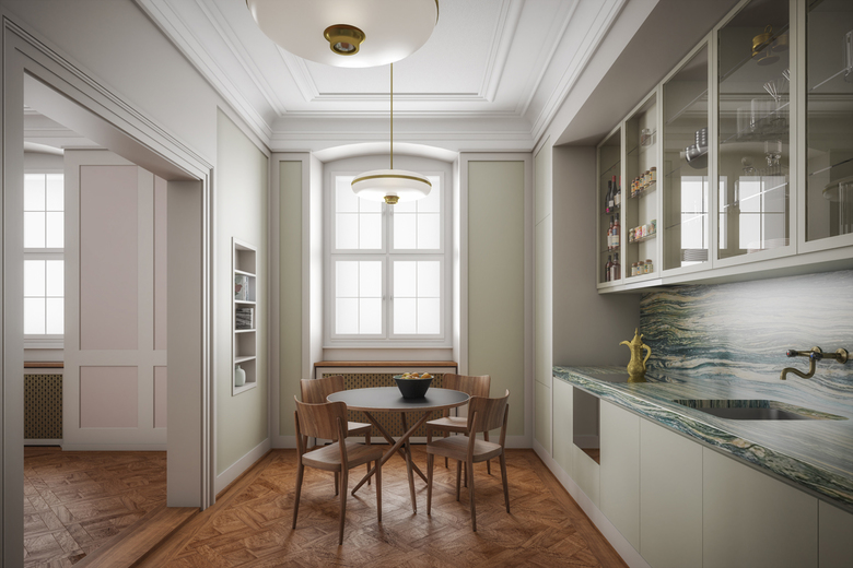 Die Raumfassung der Küche - mit dem Prinzip von Rahmung und Füllung - wird nach Vorbild des benach- barten Eckraumes mit seinen raumhaltigen Täfelungen interpretativ weitergeführt. Der bestehende Raum ver- kleinert sich angemessen um die Dimensionen der Küchenelemente und die der technischen Installationen, die sich in das Blendwerk integrieren und die einfache geometrische Raumordnung aufrechterhalten. Dabei können sämtliche Gerätschaften eines gehobenen Wohn- standards - bis hin zum Waschturm - aufgenommen werden. Der Tafelparkett aus geölter Eiche und die Stuckdecke werden eingekürzt und treu nach den Orna- mentbüchern der Zeit angepasst. Unter Berücksichtigung der horizontalen Raumgliederung ist die Arbeitsfläche aus grünocker geadertem Quarzit und dem einsehbaren Hochschrank in das Blendwerk als Nische eingestülpt. Als Reminiszenz an die frühen Wunderkammern wirkt die Oberschrankvitrine, mit dem zur Schau gestellten Famili- enporzellan auf Glastablaren wie ein persönliches Raritä- tenkabinett des Kochens. So gewinnt auch der Wohn- raum nebst dem Kachelofen und den raumhohen Bücher- regalen - mit direktem Blick in die Wohnküche - eine weitere Attraktion hinzu. Getreu den Präferenzen des Klassizismus folgt auf die bunte blaugraue Eingangs- halle und das heitere rötliche Wohnzimmer die helle grünliche Küche.