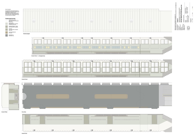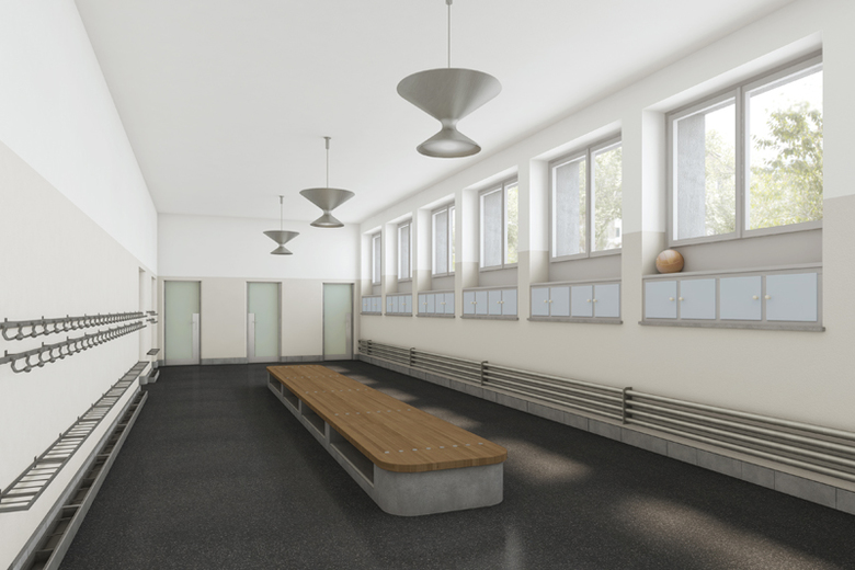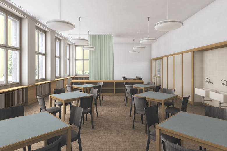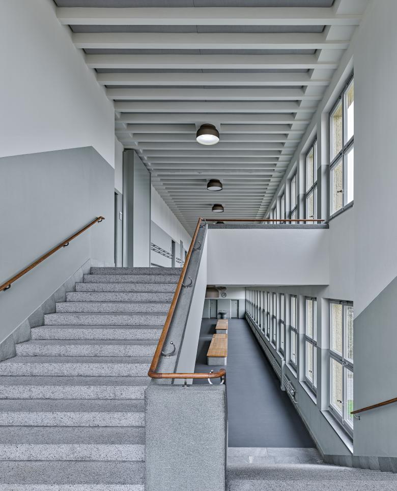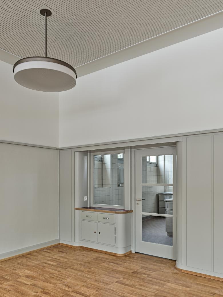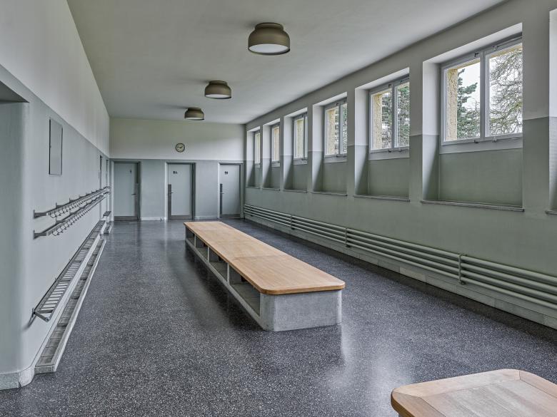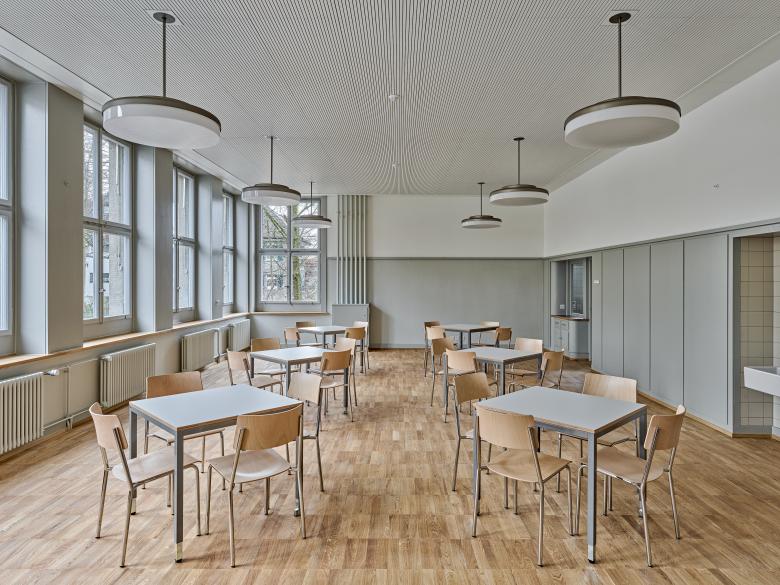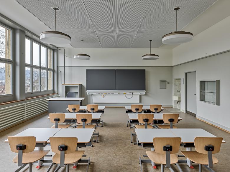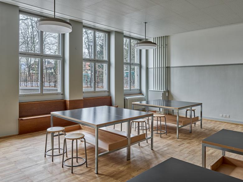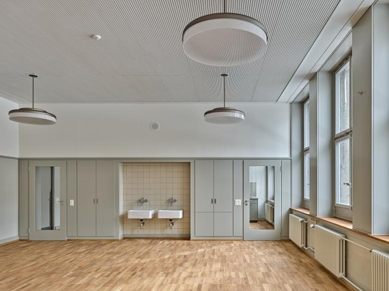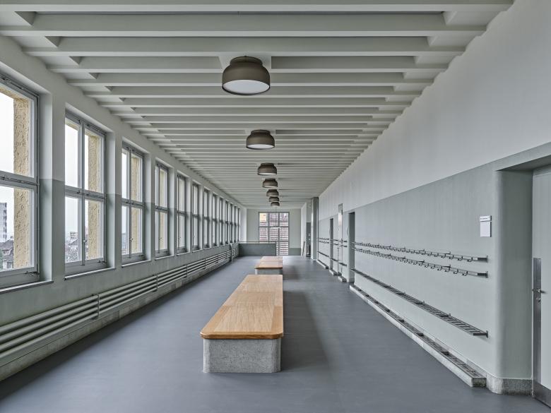 Besondere Beachtung bei der jüngsten Instandsetzung galt der energetischen Ertüchtigung der Gebäudehülle und dem sommerlichen Wärmeschutz. im Dialog mit der Denkmalpflege wurden fallweise DV-Fenster mit Isolier- gläsern aufgerüstet sowie Markisen und einzelne Flügel motorisiert. Die dadurch entstandene Installationsdichte von Elektroanlagen ist sichtbar in Rohren geführt und betont zusammen mit den Gehäusen der Leuchten den industriellen Charakter. Gleiches gilt für Möbel der Steu- erung und für Massnahmen der Raumakustik, die sich selbstverständlich unter der Prämisse der funktionalen Ästhetik in den Ausbaustandard einreihen. Weitere Aus- bauten im Tiefparterre und in den Erschliessungsräumen befolgen diese Strategie. Die geräumigen Korridore sind vom Treppenhaus mit Brandschutzfalttoren abtrennbar, so dass nebst dem üblichen Garderobenbetrieb zusätz- lich Raum für den erweiterten Lernbereich entstand. In die Jahre gekommene Bauteile und Oberflächen wurden auf Basis von Befunden sorgsam restauriert.