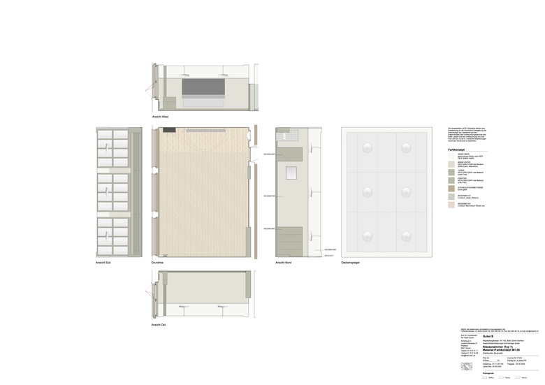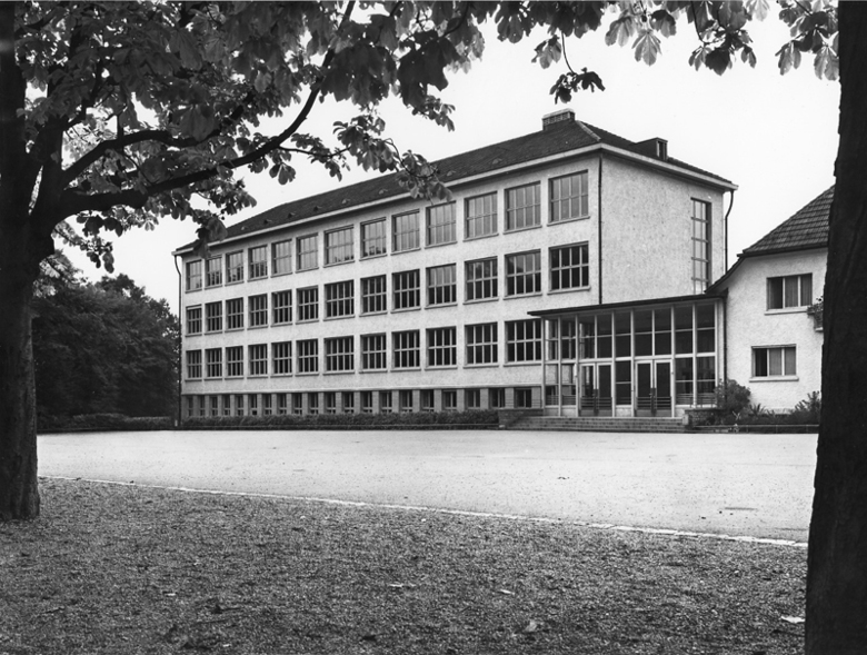 Der Erweiterungsbau Gubel B, von Karl Scheer 1933 als vorläufig letzter Baustein auf dem Areal erstellt, ist mit seiner kubischen Erscheinung, den grossformatig ausge- stanzten Fensteröffnungen in der Putzfassade, den fein- gliedrigen Fenstern und den zeittypischen Ausstellmar- kisen ein ausgezeichneter Zeuge für den Schulhausbau der gemässigten Moderne in der Schweiz. Sachliche Nüchternheit steht im fein austarierten Wechselspiel zum beispielhaft ausgewählten Materialeinsatz, der in allen Belangen wesentlich auf Dauerhaftigkeit ausgelegt wur- de. Innen prägt ein filigranes Tragwerk aus Mauerwerk und Bimshohlstein-Betonrippen-Decken die Raumbildung. Der stark funktional motivierte Innenausbau und die prag- matisch ausgelegte Gebäudetechnik als industrielle Er- rungenschaft dieser Zeit, lassen eine unverkennbar nüch- terne Stimmung erkennen.