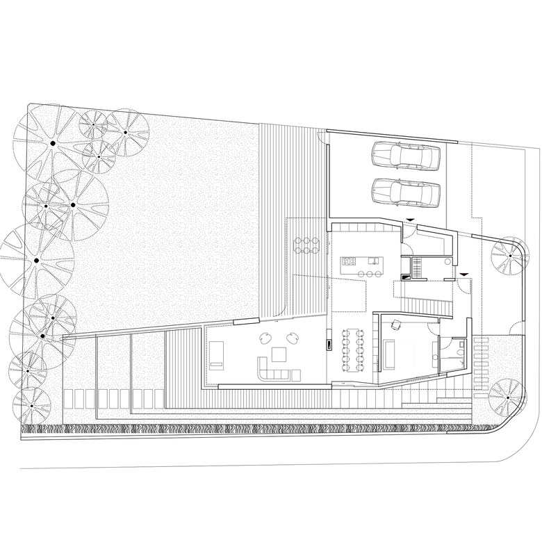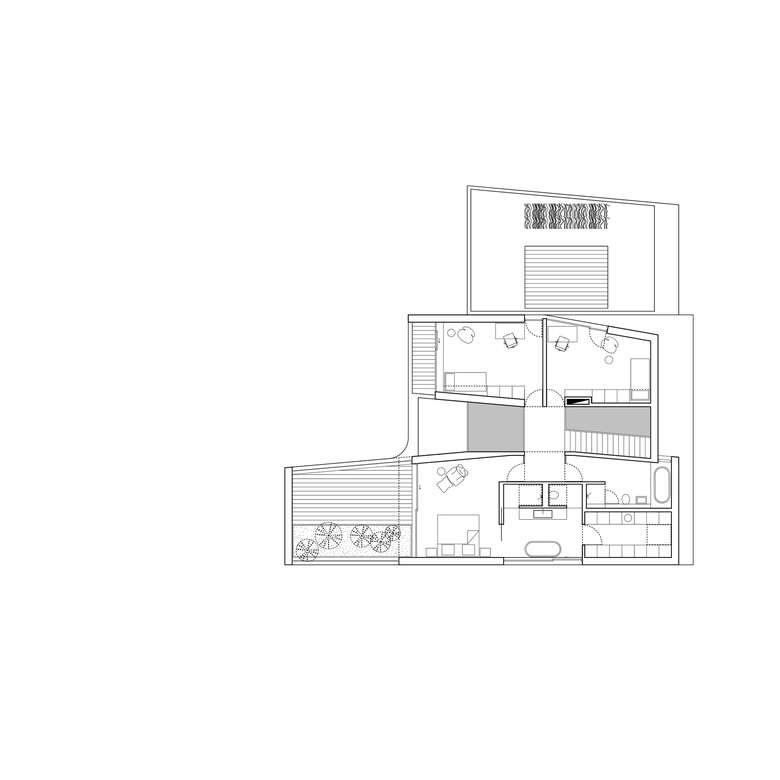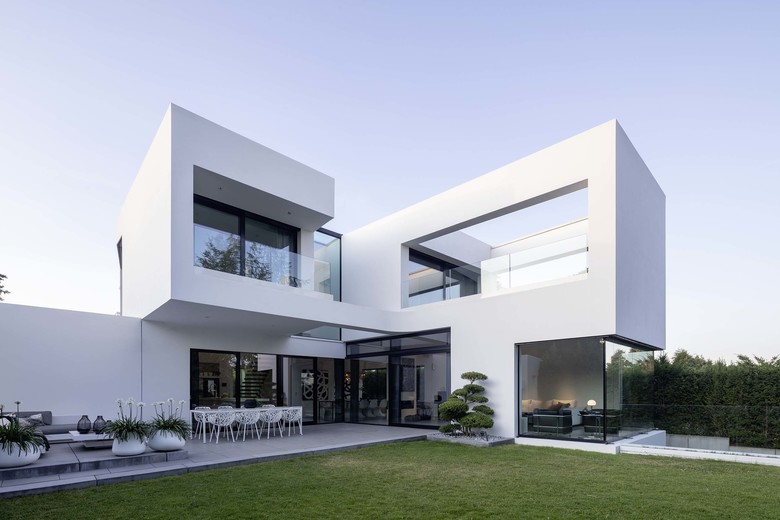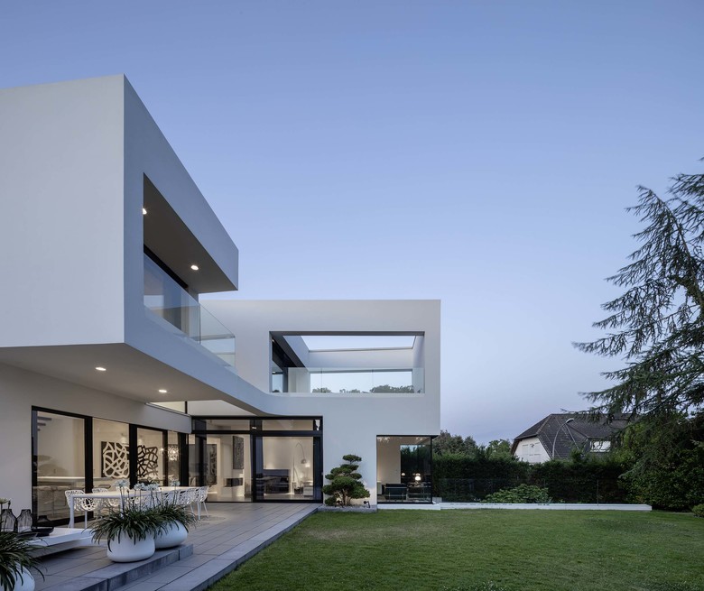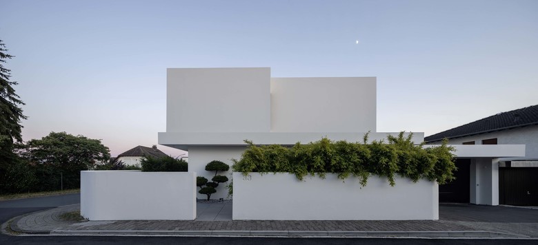 So erscheint das Haus im Norden und Osten kubisch und abstrakt. Durch den eingefassten Vorhof und eine weitgehend geschlossene Fassade werden Bezüge zum Außenraum minimiert. Auf der der Südwestseite löst sich das Haus zum privaten Garten durch großflächige Öffnungen, Auskragungen und Terrassen auf, um sich mit diesem vielfältig zu verbinden.