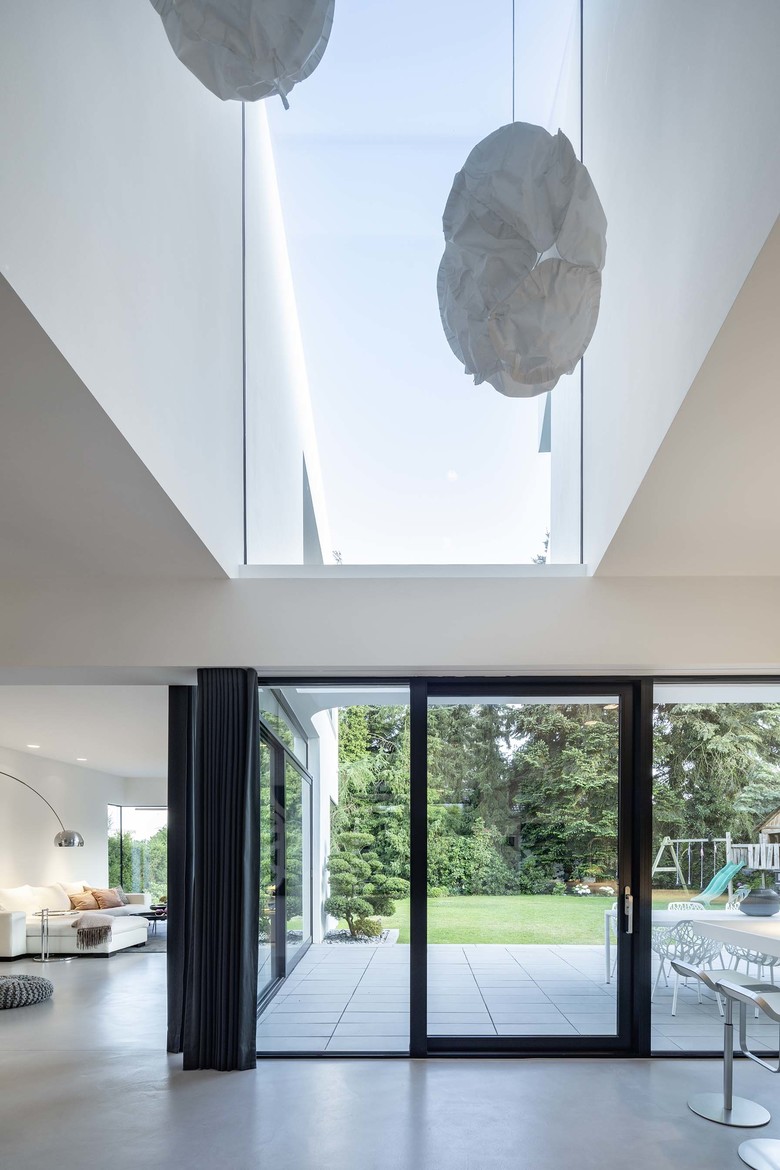 So wird die Verzahnung von Innen- und Außenräumen mit unterschiedlichen architektonischen Mitteln verstärkt: die Terrasse dient als außenliegender Wohnraum; ein Balkon erweitert eines der Kinderzimmer in den Garten; die Dachterrasse, die die Masterunit nach außen erweitert, rahmt den Blick in die Landschaft und Garten; der Tiefhof gibt der Einliegerwohnung einen geschützten Außenraum; und das Wohnzimmer wird an seinem südlichen Ende durch eine großflächige, über Eck geführte, Verglasung einem Wintergarten ähnlich.