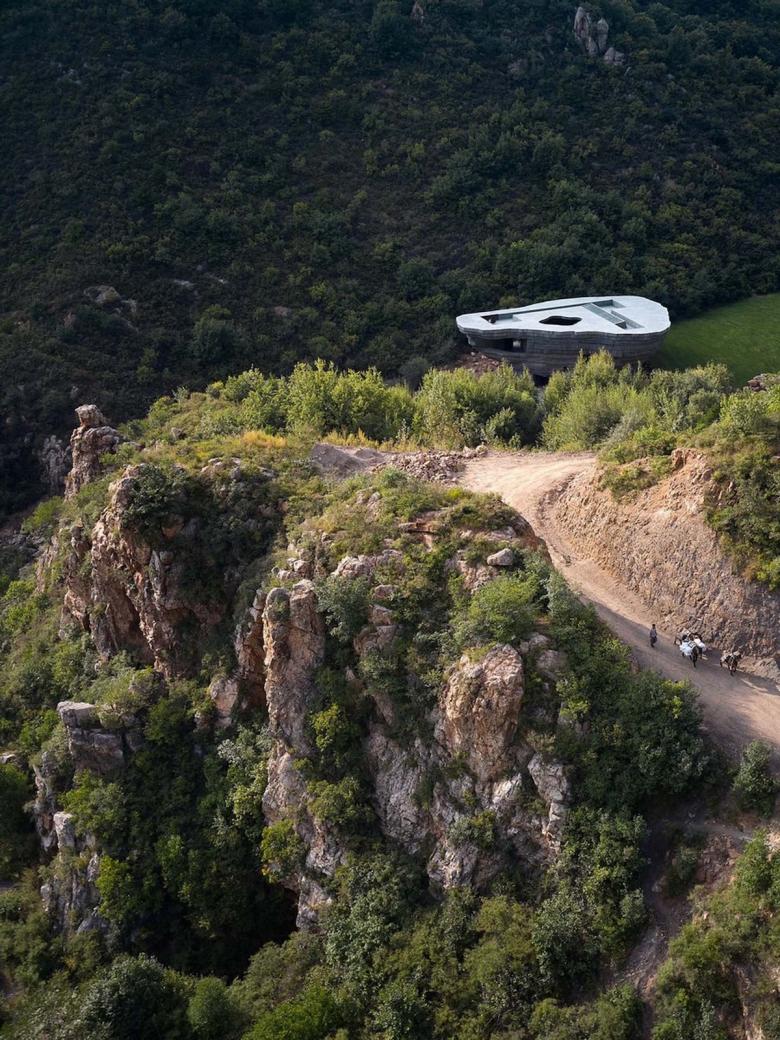 OPEN’s founding partners Li Hu and Huang Wenjing were driven by a desire to minimise the footprint of the concert hall in the valley, creating a structure that was in dialogue with impressive natural landscape, while also feeling undeniably man made. The resulting rock-like structure is composed of an inner and outer shell with the space between operating like a truss, and was ultimately achieved through close collaboration with international engineering firm, Arup. Formed from concrete, each striation cantilevers out from the previous layer to create the inverted cone shape. Winding staircases weave through the building to a rooftop platform that offers panoramic views of the valley and Great Wall. In the interior spaces, accents of bronze for details such as handrails and doors are used to create a warm contrast against the concrete.