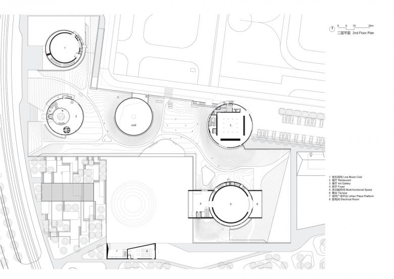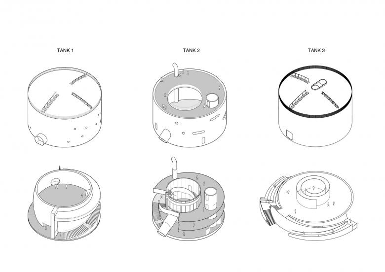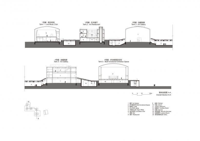 The design strategy employed to retrofit the five tanks varies according to the requirements of the different programs housed within them. Tank 1—a two-story live-house and bar—contains a drum-shaped inner tank with curving walls that improve the space’s acoustics for musical performances. Tank 2—a restaurant—is organized around a circular central courtyard, on top of which rests a roof deck for alfresco dining. Tank 3 remains intentionally unchanged, with its original interiors offering a unique domed space for displaying large contemporary artworks and installations. The addition of an operational oculus skylight allows natural light and even rain to enter the gallery interior. Tank 4 contains a three-level cube that offers more conventional spaces for gallery and canvas art, while Tank 5 features an additive rectangular volume that passes through the body of the tank and emerges on either side to form two stages on both ends. From the exterior the surface of all of the tanks preserve their original industrial aesthetics; only occasional round or capsule-shaped openings and portholes were added.