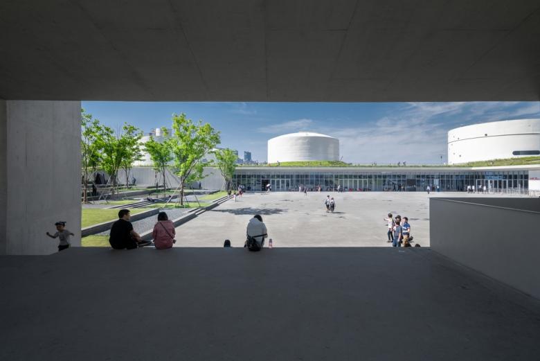 Tank Shanghai’s design purposefully rejects the idea of a bordered site. Long, sloping landscaped meadows down to and around each tank gallery offer open access to the street and riverside, inviting visitors and passerby to move freely between the city, nature, and art. Amidst the backdrop of Shanghai’s many more exclusive cultural projects, this gesture creates surprising social inclusivity. Many of those who come to the Tanks do so not only to view an art show, but also to jog or picnic on the project’s undulating landscaped lawns. This unusually open approach to the museum space has already brought about unexpected benefits and inspired new operational models for the art center. Within a year, Tank Shanghai has hosted not only high-profile art exhibitions but also a fashion week, book fair, art festival, and AI conference. By introducing new audiences to the traditionally closed-off space of the art center, Tank Shanghai has brought unprecedented energy to the formerly industrial neighborhood and to the southwest banks of the city at large.
