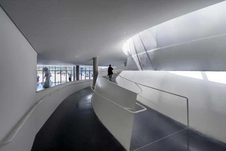 Central to the project’s design is the merging of architecture and landscape through a Z-shaped “Super-Surface”—a 5 hectare landscaped swath of trees and grasses which connects the five tanks and weaves different elements of the site together. Two of the tanks sit above the Super-Surface, while the other three sit halfway below, creating free-flowing indoor public spaces and offering opportunities to access each of the tanks’ galleries from beneath. Entrance ramps to each tank are wrapped with steel panels, which enter into dialogue with the curved structures of the existing tanks; steps around the tanks double as seating for the café. Floor-to-ceiling windows and skylights flood these otherwise dimmer underground spaces with light and allow gallery visitors to observe seasonal changes in the park landscape beyond.