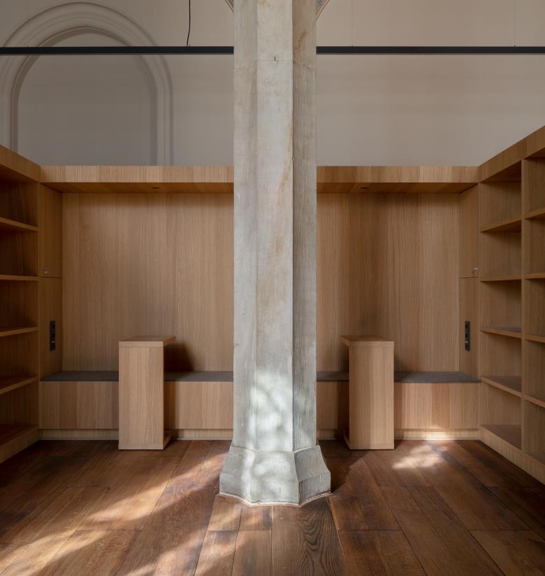 Vertikal aufgereihte Holzlamellen im Erd- und Obergeschoss, die in ihrer Anmutung metaphorisch an Buchseiten erinnern, schützen die Bibliotheksräume vor intensivem Sonnenlicht und Überhitzung, ohne den herausragenden Ausblick in die umgebenden Freiräume des Klostergartens sowie in Priors Garten zu verwehren.