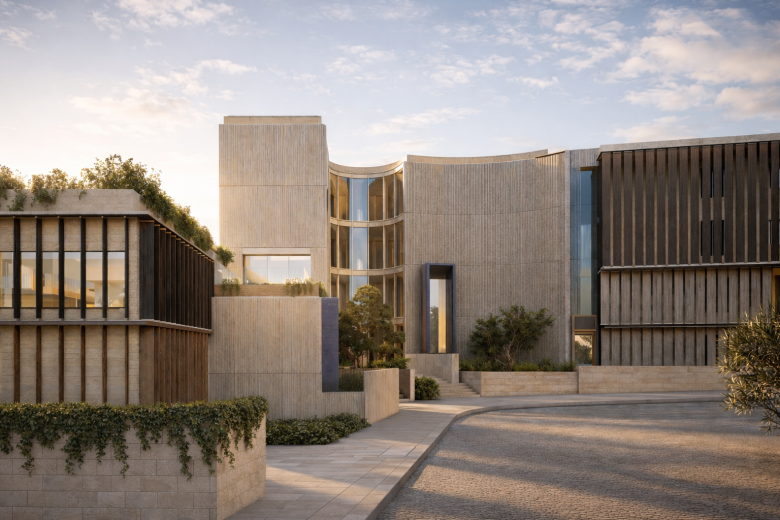 The intervention follows a dual strategy of transforming the existing architecture while introducing a unifying addition. The RAS building is rearticulated with a vertical wooden louver façade that overlays the existing stone surfaces, adding depth and solar shading while redefining the building’s architectural expression.