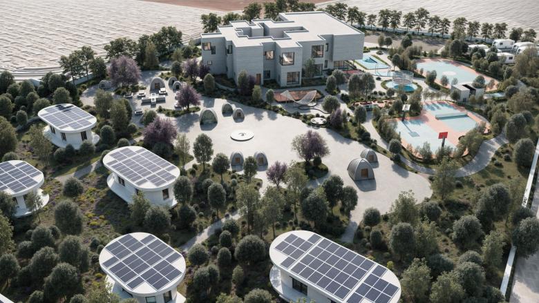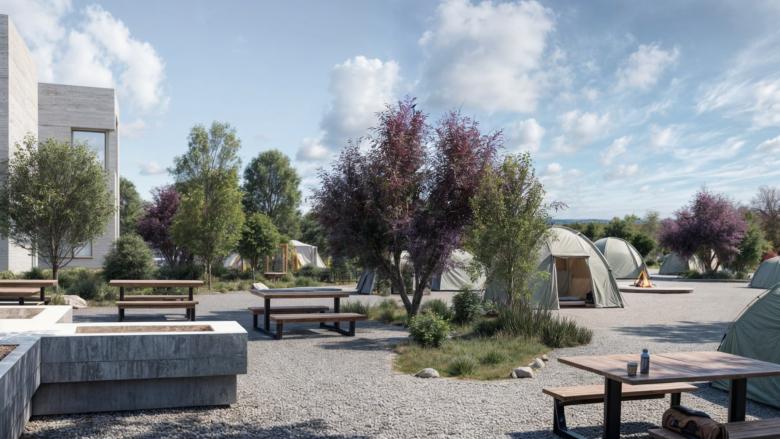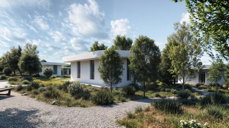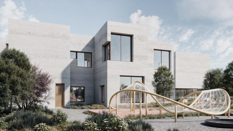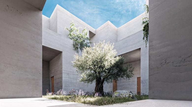 At the heart of the layout is a central courtyard anchored by an olive tree. Around it, the program unfolds to include a clubhouse, a hostel, family units, and outdoor play spaces. The courtyard serves as a social core, encouraging circulation, informal gathering, and a strong relationship between built form and landscape.