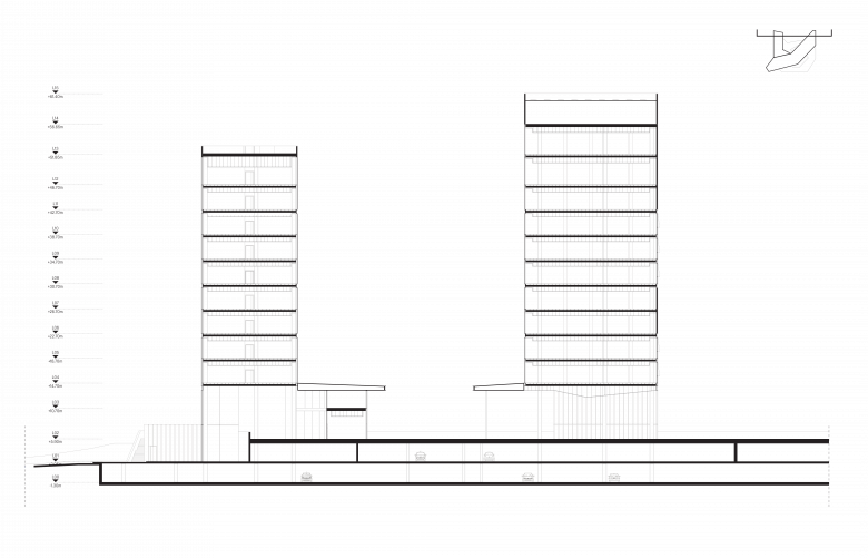 The building rises from a base below which are two underground parking floors. Creating a geometric space from which all surrounding buildings can be seen, the new aerial square developed at the building’s entrance is linked to the nearby Underground station.