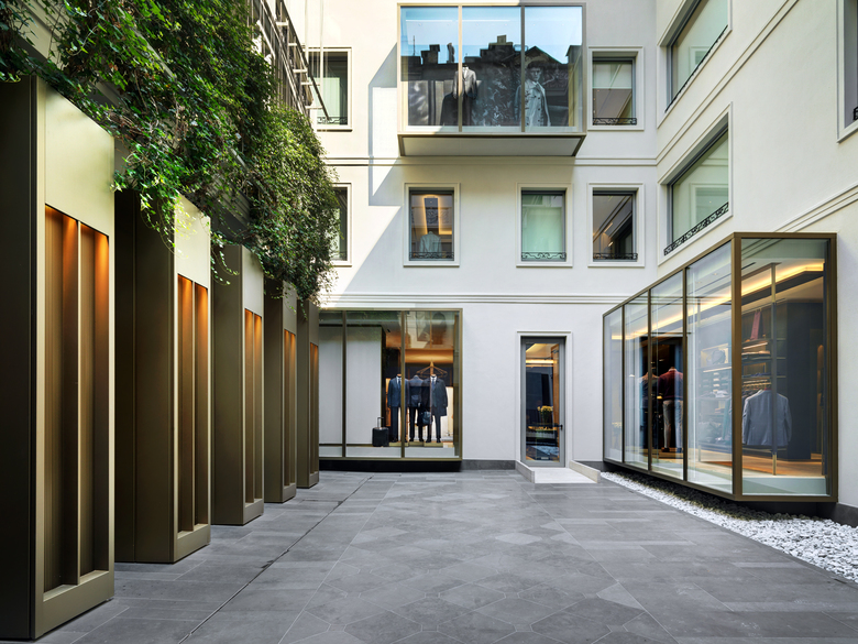The ground floor space is designed to be a seamless continuation of the building’s internal courtyard: a secret and surprising place characteristic of traditional Milanese architecture. The display windows for the various products face onto the courtyard at different heights. The entire store is constructed around interaction with the courtyard and inflowing sunlight. The spaces are all fitted with windows to recreate the setting of a luxury tailor’s shop bursting with natural light and looking onto the neighbouring streets.