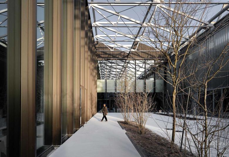 The casing is the result of technological and structural research aimed at lending the building the greatest transparency and indoor brightness. The daring and startling façade overlooking Via Tortona consists of a full-height glazed structure with vertical bronzed metal pilasters that bring to mind the sheds.