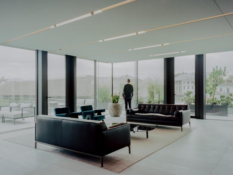 The clean-cut forms, the cutting-edge technology and the materials' quality give shape to an architecture that expresses innovation, beauty and functionality, starting from the façade developed in collaboration with Deerns. The highly technological double skin designed by Park Associati offers a balance between reflection and transparency. Similar to a filtering protective 'lens', the slightly convex façade lets the inside and the outside virtually come into physical contact and ensures optimal indoor conditions.