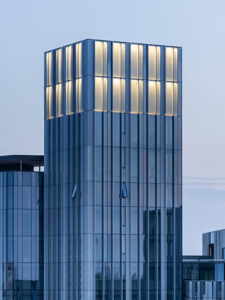 The highest volume is a 67-metre-high tower, while on the opposite side of the lot the lowest 8-metre-high structure is designed to be an auditorium. Both volumes are lit at night, the tower to resemble a lantern, a luminescent lighthouse that adds a new landmark to the cityscape.
