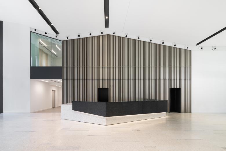 In line with sustainability-related issues, the use of materials on the façade was kept to a minimum. The depth of the jutting sheet metal shielding elements increases as they climb from the lower floors to the upper floors, where their function of sun shading is needed most. Such size variations contribute to define a fluid and dynamic perception of the entire building.