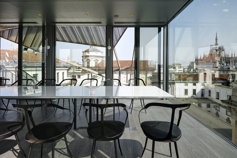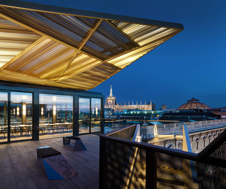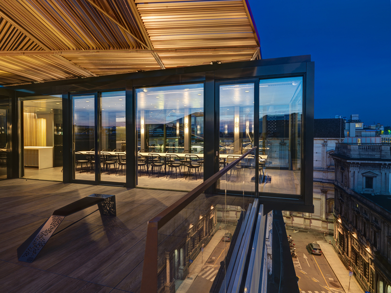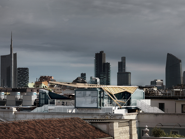 Designed to be used as a restaurant and much more, the pavilion will be installed on top of Palazzo Beltrami in Piazza della Scala, Milan.