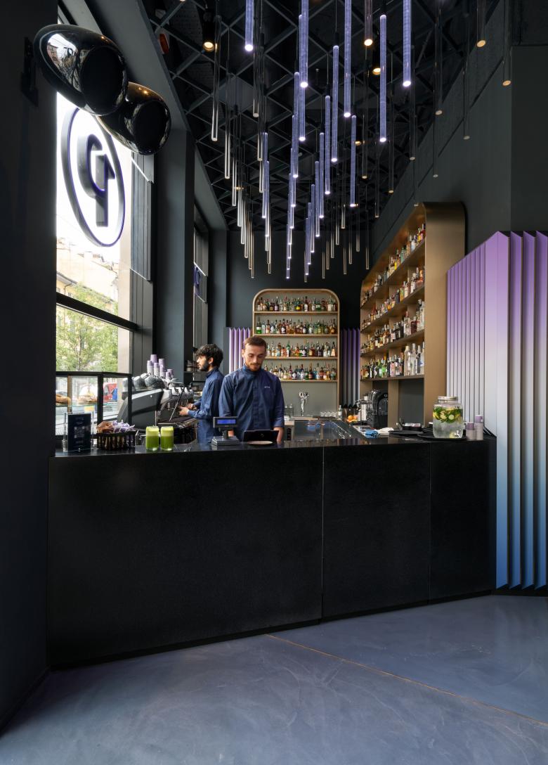 Prima Cafè is also designed as a place where private events can be organised and where people can stop and work between appointments. Focusing on the fluid identity that accompanies the premises' metamorphoses, the interior design creates a hybrid environment where the function-aesthetics combination is overturned.