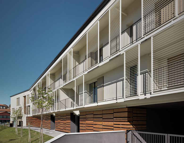 The number of materials used has been limited to a choice of three main ones: render for the surface of the walls, aluminium for the roofs, screening elements along the balconies and systems for screening the windows and larch for cladding the lower level. Larch planks have been used for form a screen to the stairwells, thereby controlling the light and ensuring privacy for these communal areas with respect to the street.