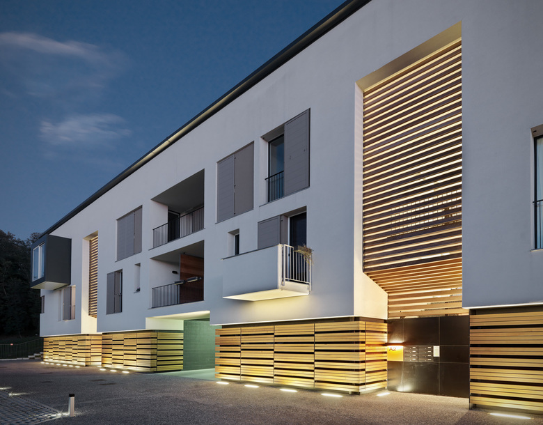 In terms of composition, the approach chosen combines traditional elements such as the double-pitched roof with an irregular pattern of openings on the facades. The two main blocks, with asymmetric pitched roofs in sheet aluminium, are on two storeys (the second houses duplex units only), differentiated by the colours and cladding materials used for the lower ground storey, as well as by the use of different street elevations, dictated by the differing orientation and optimal control of solar factors.