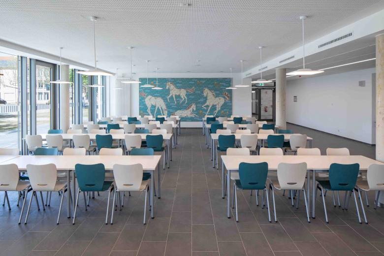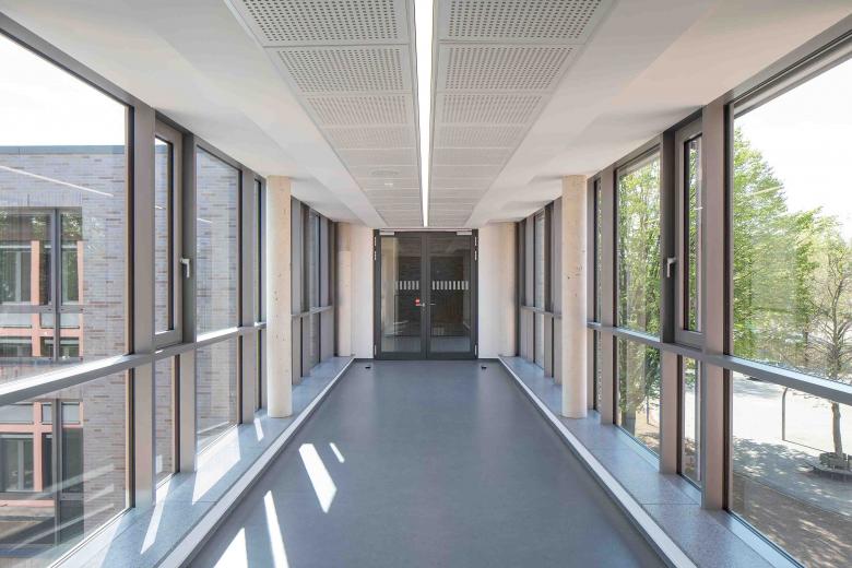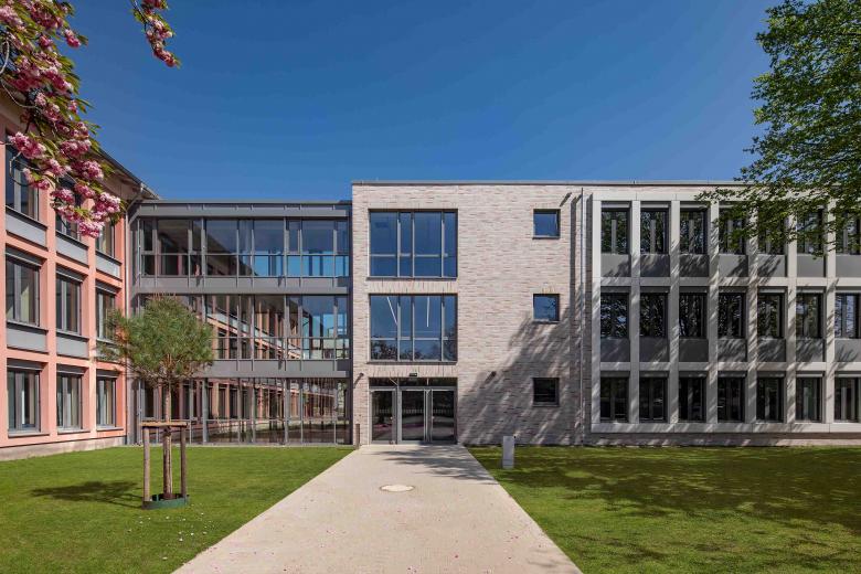 Das Bestandsgebäude des Cecilien-Gymnasiums in Düsseldorf stammt aus dem Jahr 1956 und erfuhr 2004 bis 2005 eine umfassende Sanierung. Nach Erhöhung von drei auf fünf Züge wurde eine Erweiterung notwendig, um allen Schülern ein zeitgemäßes Lernumfeld bieten zu können: Mit dem 2019 fertiggestellten Neubau konnten sich Lehrer und Schüler über zusätzliche 3.600 Quadratmeter Nutzfläche mit Klassenräumen für die Sekundarstufe l und ll sowie Fach- und Multifunktionsräumen freuen. In den Obergeschossen laden großzügige Aufenthaltsbereiche in den Fluren zum Verweilen ein. Zudem ist im Erdgeschoss eine Mensa untergebracht, die mit einer großen Fensterfläche hell und freundlich wirkt. Im Außenbereich direkt vor der Fensterfläche schließt sich eine 130 Quadratmeter große, weiträumige Terrasse an.