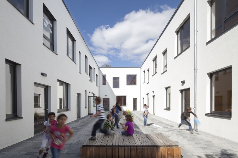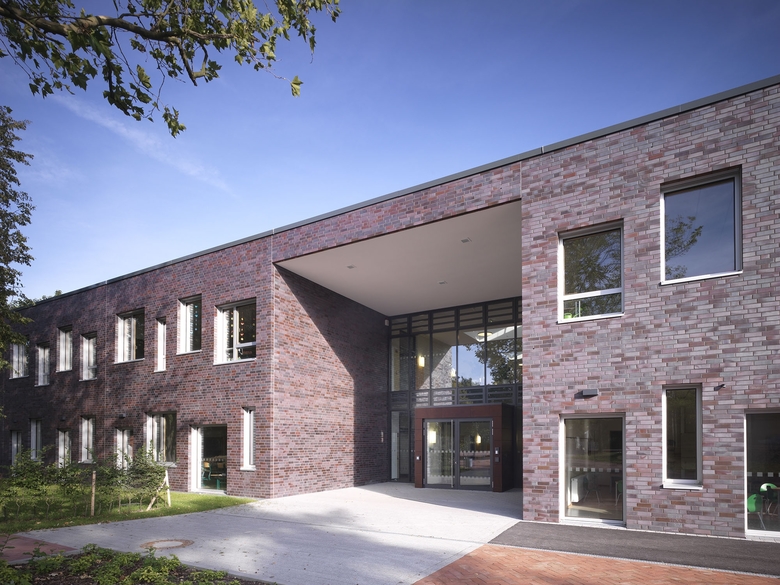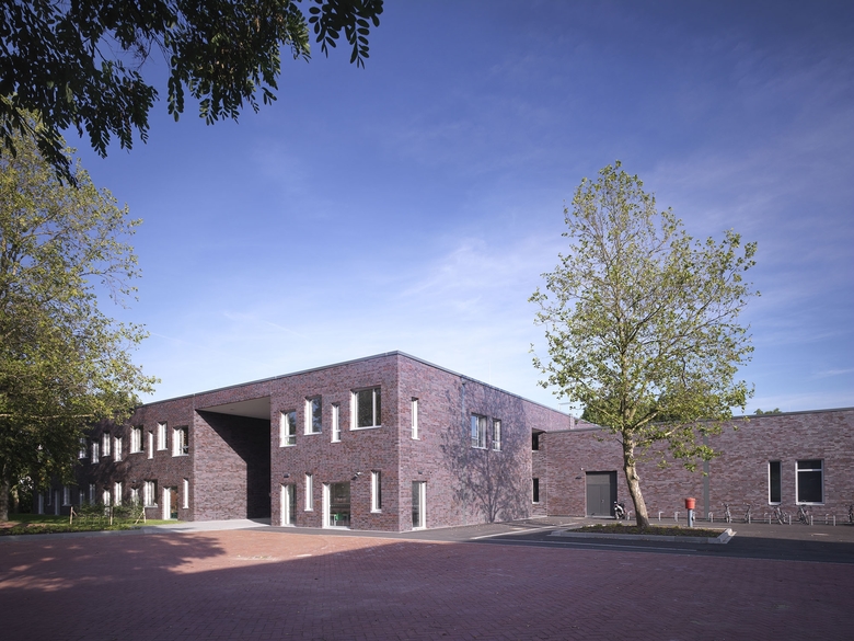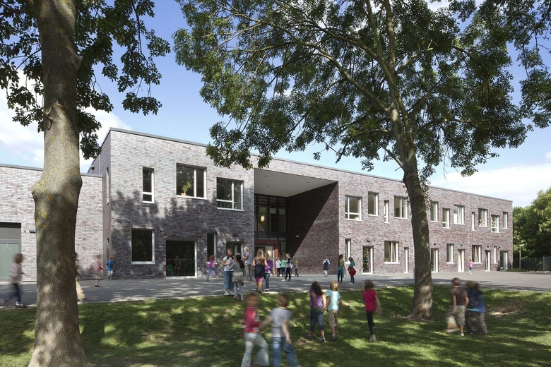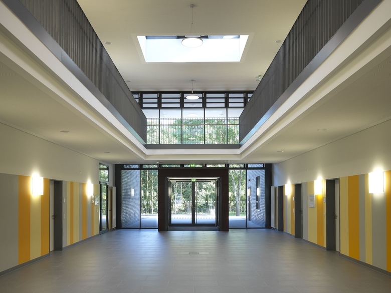 Der Neubau ist als Solitärbau Teil des bestehenden Schulzentrums, Grundschule und Mehrzweckhalle sind direkt ablesbar. Alt- und Neubau bilden ein Ensemble ohne dass die eigenständigen Charakteristika der einzelnen Gebäude verloren gehen. Die Grundschule ist als kompakter kubischer zweigeschossiger Baukörper konzipiert. Prägende Gestaltungselemente sind die zentrale Erschließungshalle, die gleichzeitig das Forum beinhaltet und der Innenhof. Eine Galerie-aufweitung bietet Platz für einen offenen Sitzbereich mit Blick auf das schulische Leben. Rund um den Luftraum des Forums ermöglichen Verglasungen in der Fassade Blickbezüge.